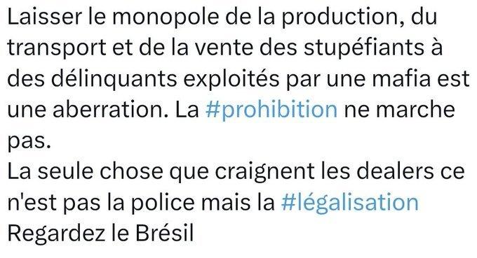 Est-ce que ça vaudrait encore le coup pour les dealers d'ouvrir 2700 à 4000 points de deal, avec tout ce que cela implique, pour un nombre de clients potentiels plus que divisé par 10 par rapport aux fumeurs de cannabis ? Franchement qui peut croire un seul instant que la légalisation du cannabis puisse avoir d'autres conséquences qu'une baisse du trafic, même si ce n'est que de 30% ou 40% comme en Uruguay ou Etats Unis où les conditions de vente sont moins compétitives ? Au Canada en 5 ans 80% de l'approvisionnement est désormais légal ! IL suffit de faire les choses correctement, et encadrer cette légalisation qui permettrait de faire rentrer de l'argent dans les caisses, de libérer du temps pour la police et la justice, d'autoriser la prévention...